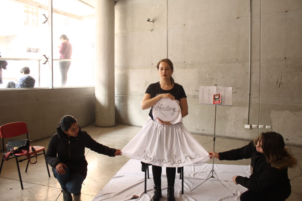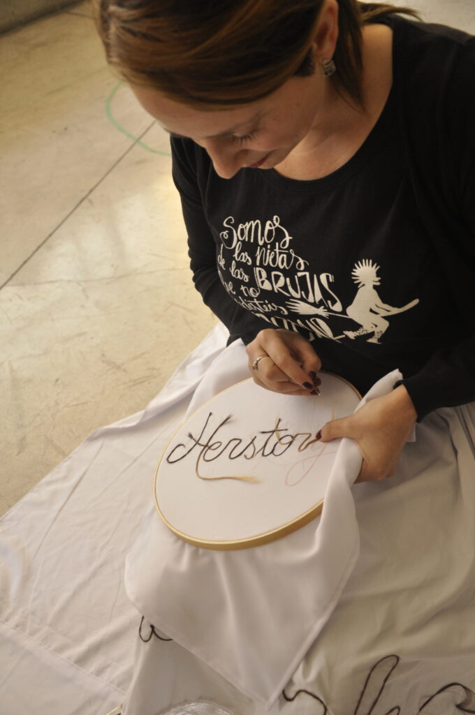 La obra se titula  «Tejidos de filiación y tiempo: Herstory» y es una crítica a la historia documentada que, en su mayoría, excluye a las mujeres del relato oficial. Tomo un juego de palabras entre «history» y el pronombre «her» (en inglés: «su» de ella) para proponer un relato que a menudo es omitido: el de visibilizar a través del poder de la palabra, a  distintas mujeres que han sido y son relevantes en su disciplina. De esta forma, son nombradas artistas, teóricas, literatas, científicas, filosofas, etc. para evidenciar que existen, que están ahí creando y aportando, aunque el relato hegemónico insista en ignorarlas.