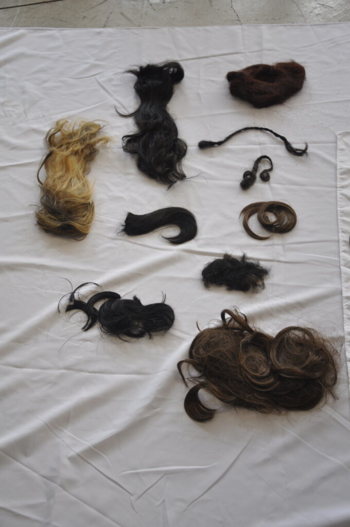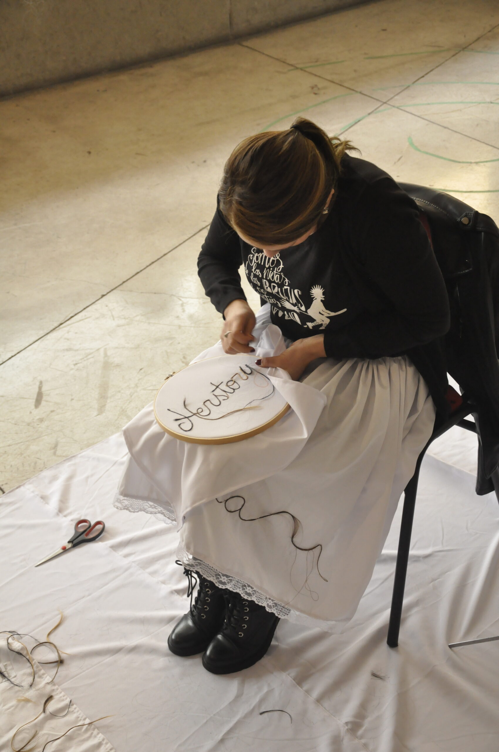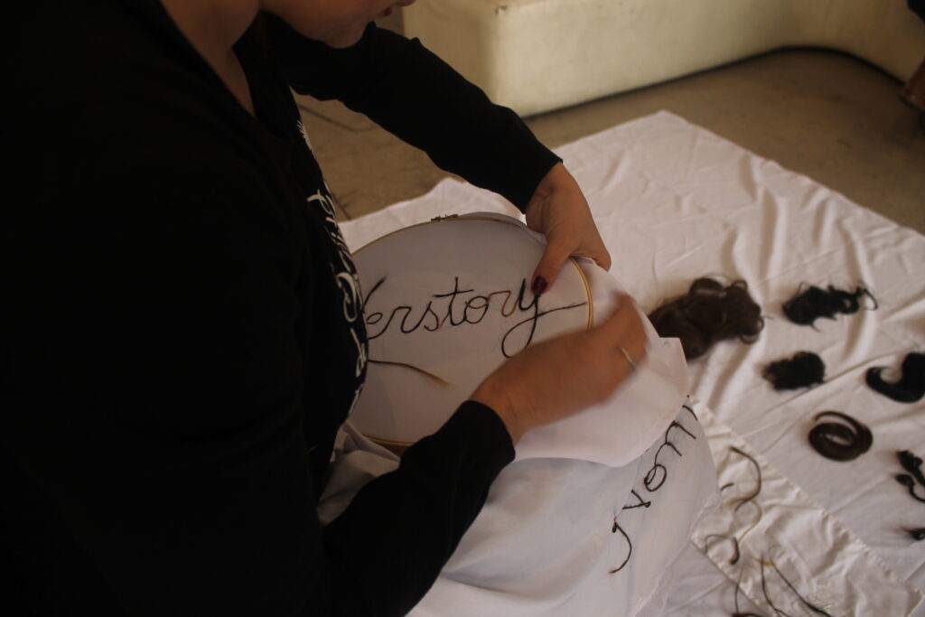 La obra consiste en hilar cabello de diferentes mujeres que hicieron llegar sus retazos por una convocatoria puesta en circulación a través del «boca a boca» a la que respondieron científicas, artistas, escritoras. La acción consistía en hilar un gran cordón con estos cabellos que alcanza un largo de dos metros aproximadamente, para luego bordar con ellos la palabra «Herstory»  en un bastidor de bordado. Como punto final de la performance, los nombres de estas mujeres son leídos a viva voz en un espacio de la Biblioteca .