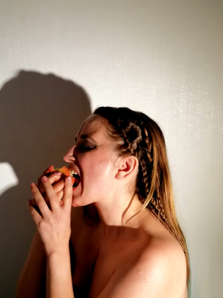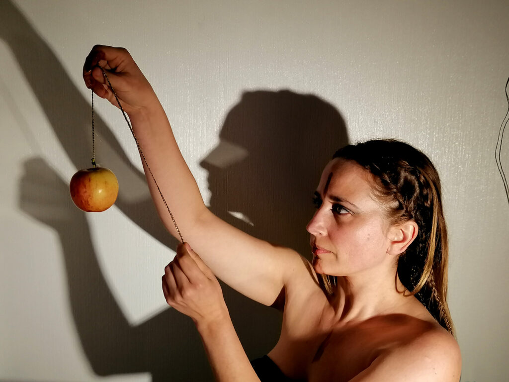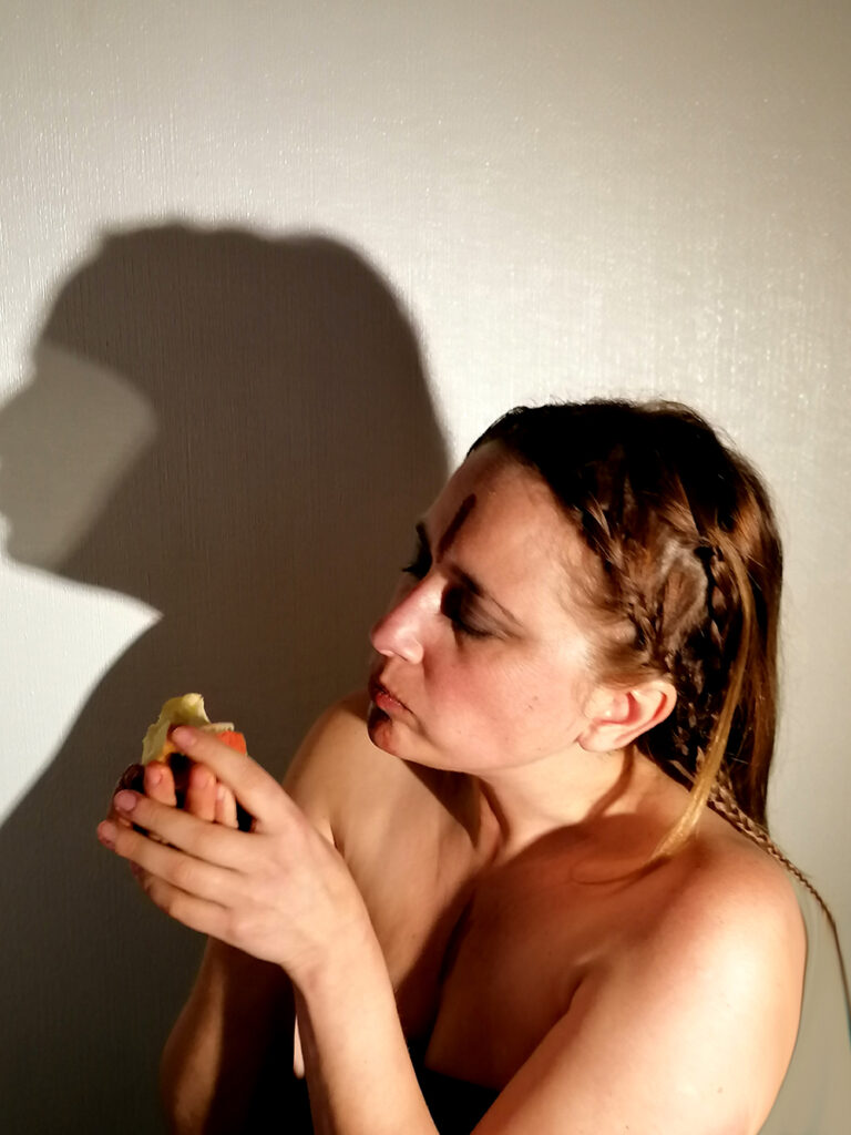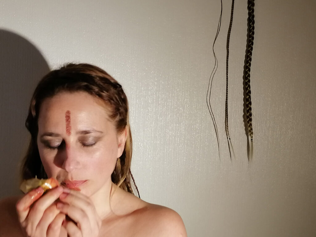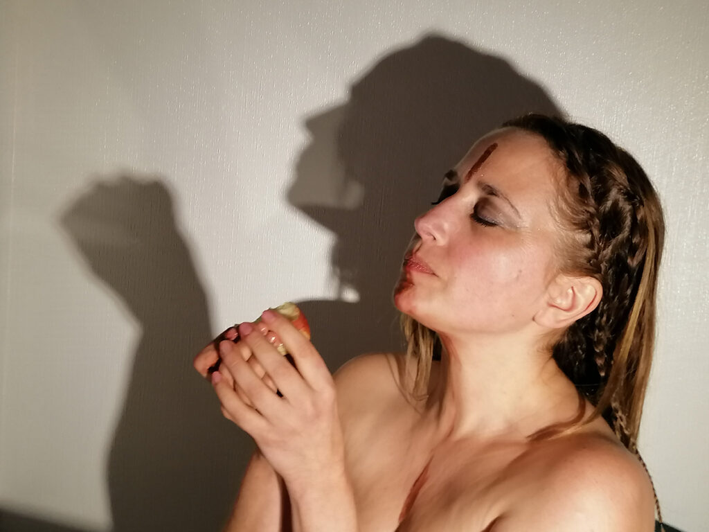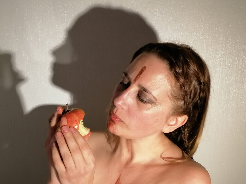 “Poéticas del origen. Acción 3” es el fragmento de una performance que propone reflexionar(nos) internamente para desatar nudos y volver a la conexión con uno mismo y la naturaleza, desde el erotismo y la ritualidad, en un momento en que estamos hiperconectados/as por distintas interfaces y redes sociales, socavando la idea de comunidad y desestabilizando las vidas. “Poéticas del origen. Acción 3” se centra en la acción de comer una manzana roja, haciendo alusión al fruto bíblico que simboliza el acceso al conocimiento; de paso, nos recuerda también la misoginia que ha imperado durante siglos por esta causa, transformando los cuerpos de las mujeres en pecadores y culpables, incluso en pleno siglo XXI.