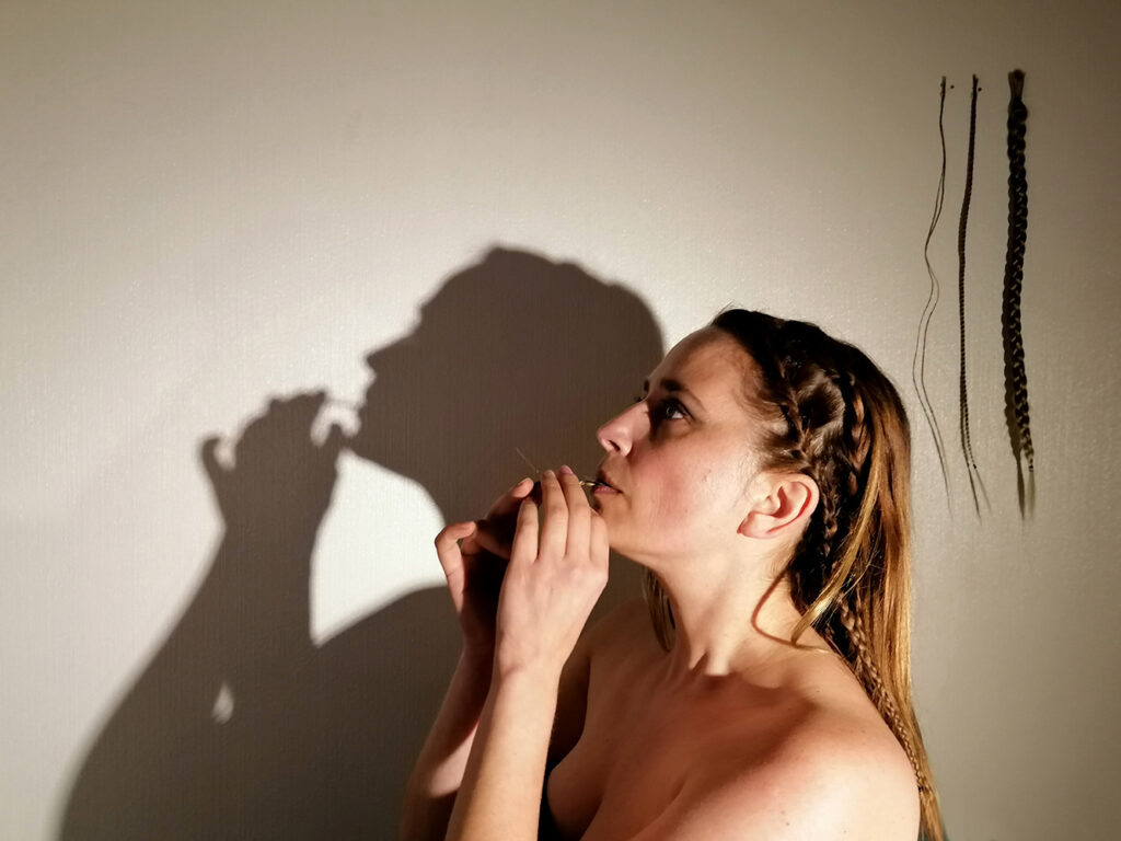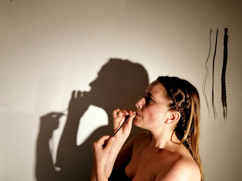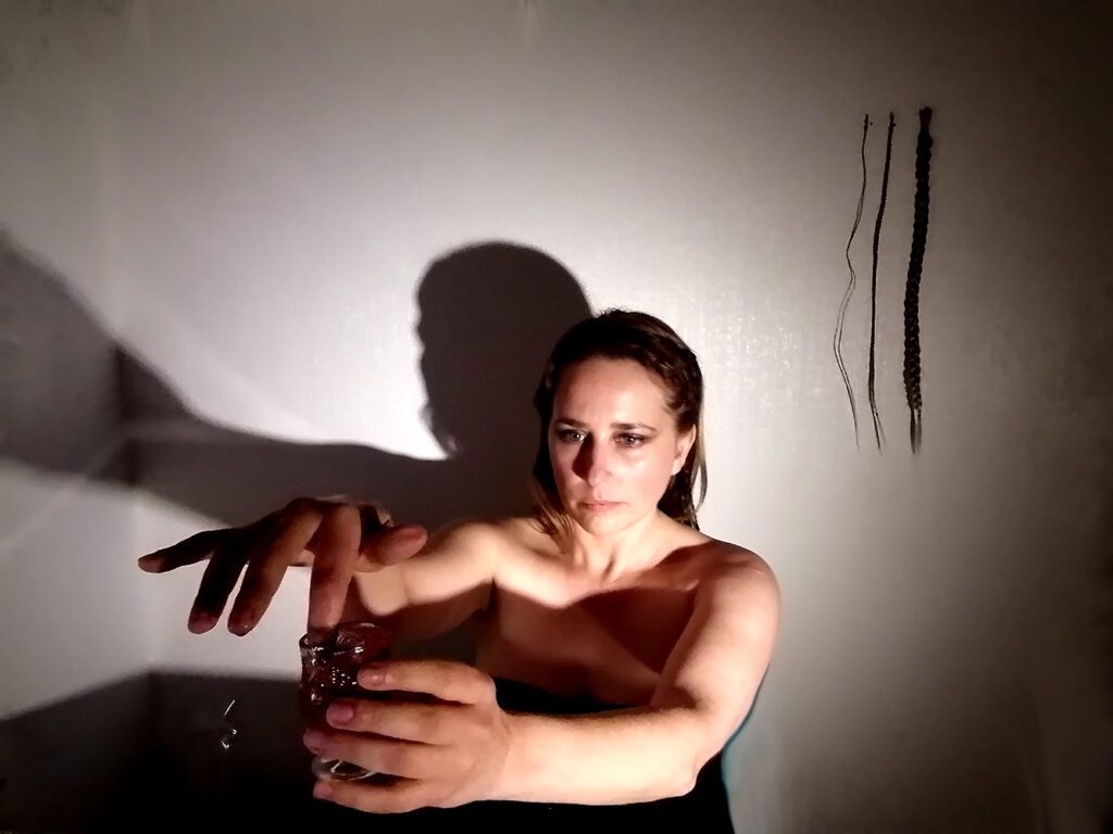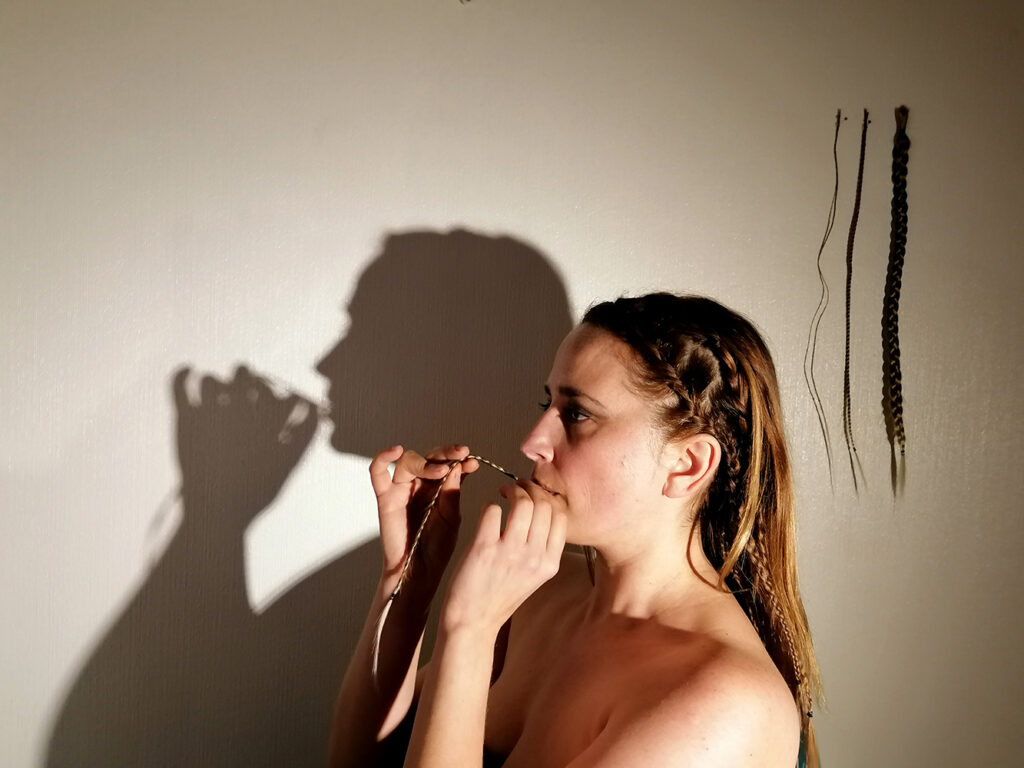 En «Poéticas del origen» retomo materialidades con las que había trabajado anteriormente: sangre, tierra, cabello humano y manzana, para reflexionar acerca de la ritualidad (o la pérdida de ella) y la reconexión entre erotismo y espiritualidad. Poéticas del origen propone reflexionar(nos), mirar hacia dentro para desatar nudos y volver a la conexión con uno mismo, el erotismo y el rito. Relación entre música, mitología, filosofía y artes visuales (interdisciplina).