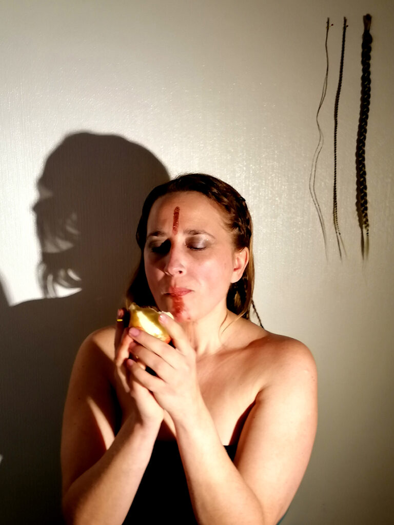 Materialidades: cabellos trenzados, manzana roja, sangre y tierra de color.