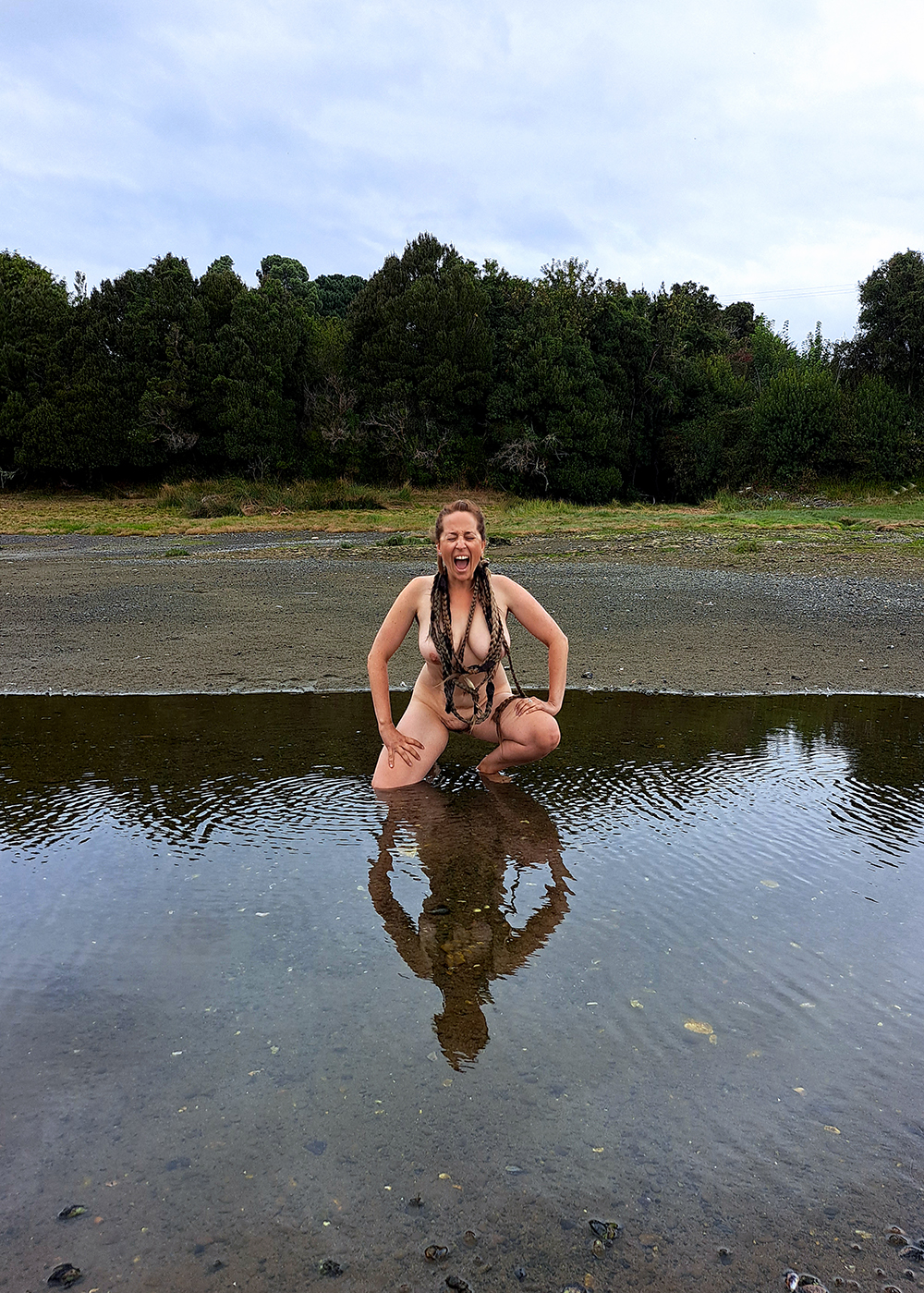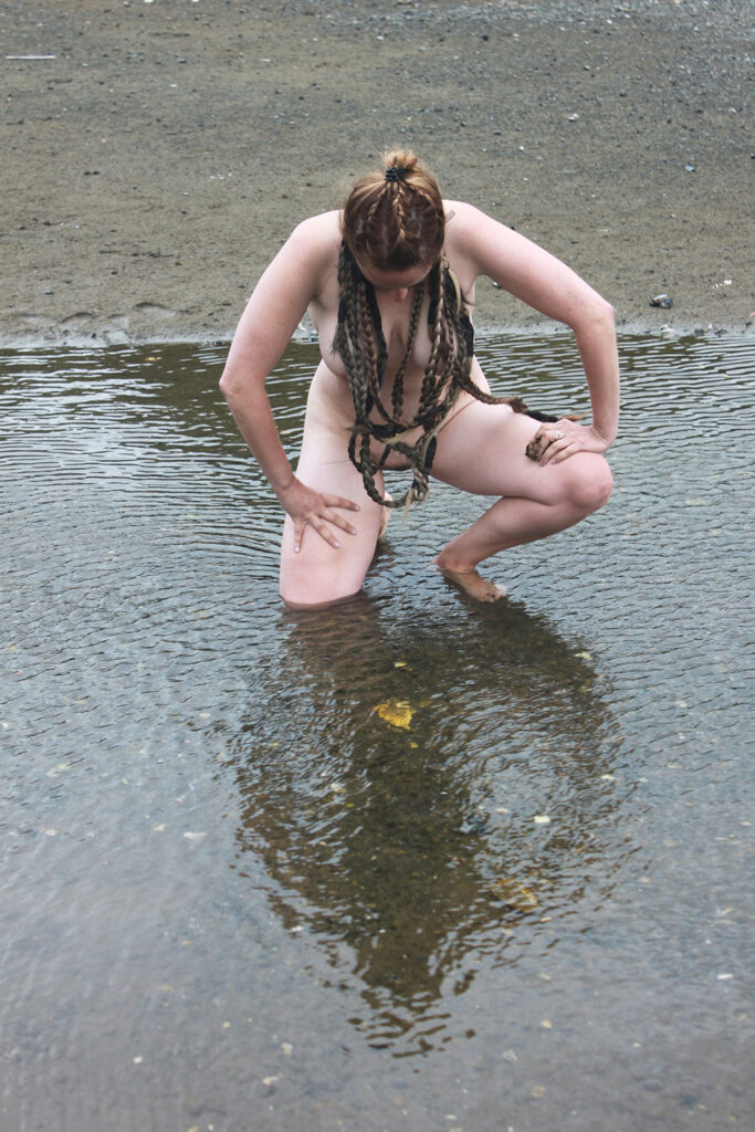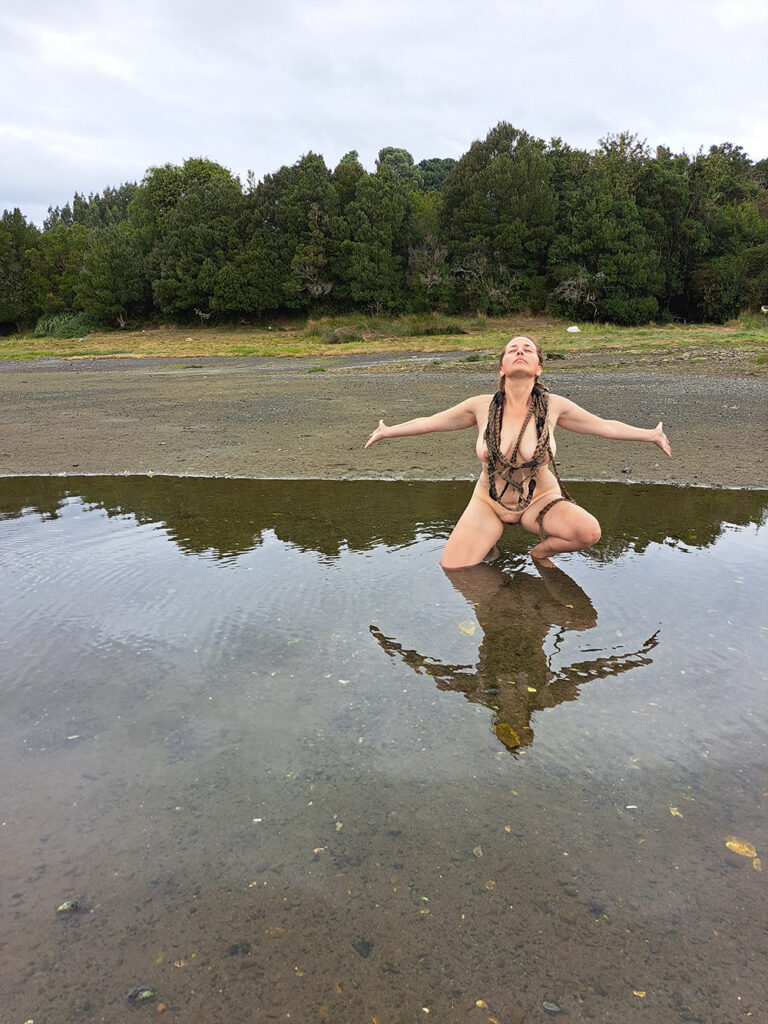 II BIENAL MOMBO ART GALLERY,CAMPIÑA DE SEVILLA, ESPAÑA (15 AL 30 DE JUNIO DE 2023). “Poética ritual de los cuatro elementos: Agua”. Impresión fotográfica del registro de la performance realizado por Constanza Reyes Zerené en Calbuco, 70×50 cm.