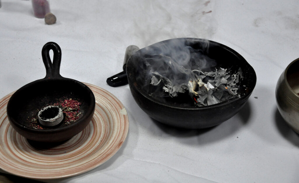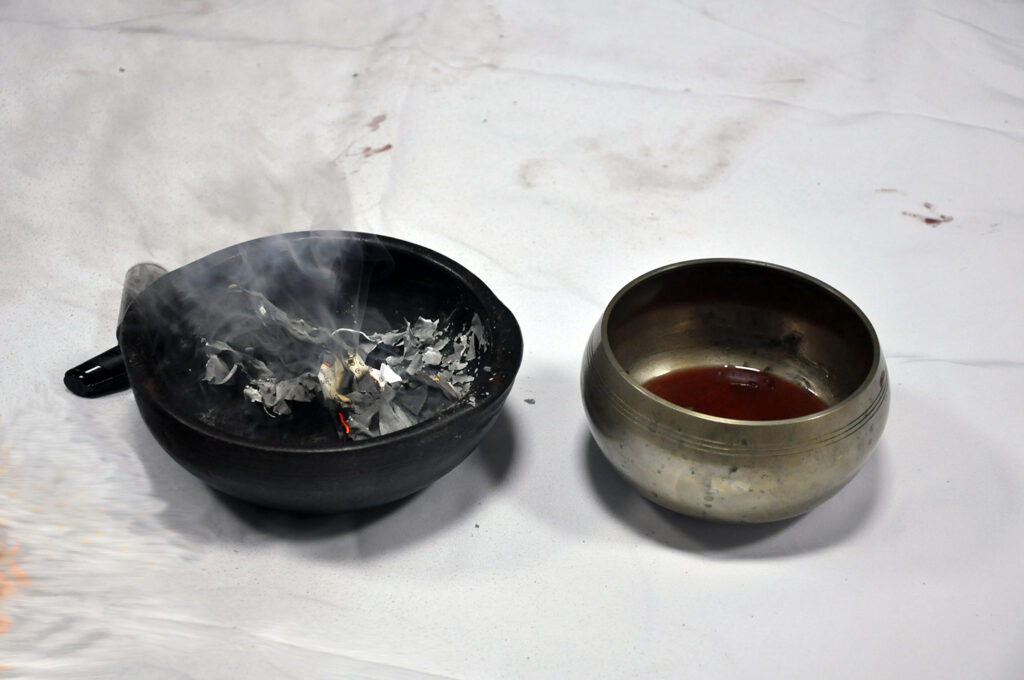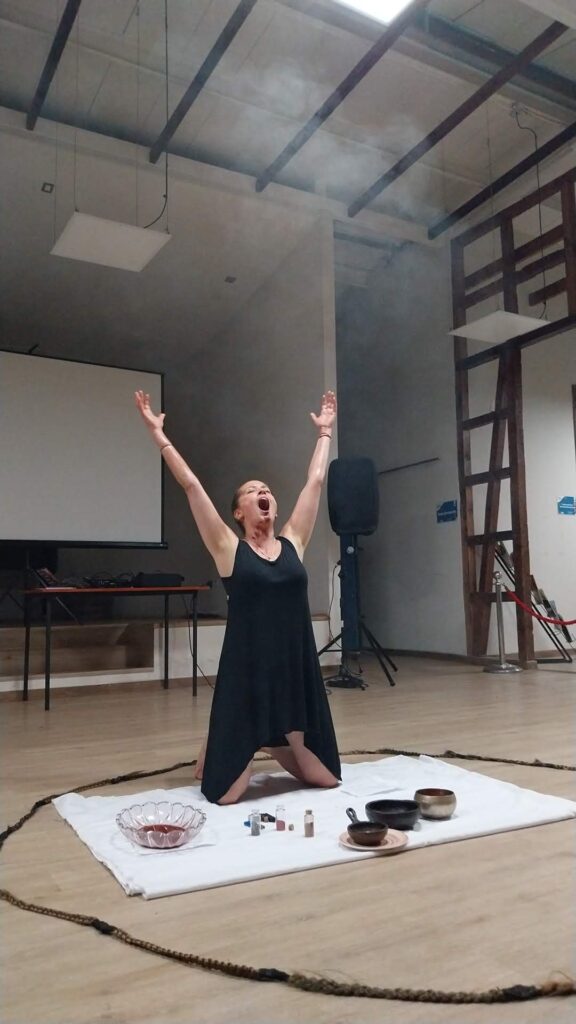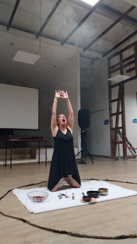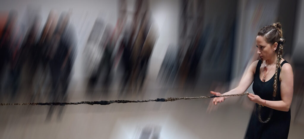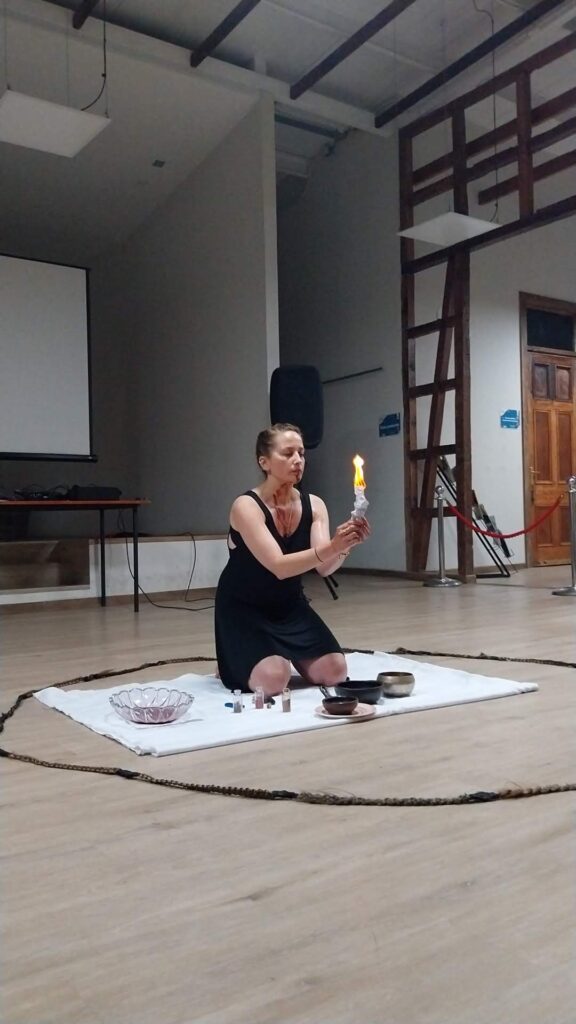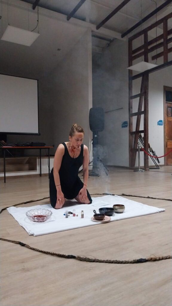 “Poetics of the rite / Poéticas del rito”. Impresión fotográfica del registro de la performance realizado por Davixo Berimba en Festival Encuentro de Performance Ritual, Quilpué, 2023. Dos fotografías de 100×150 cm. Esta obra es parte de una serie de performances realizadas en torno a la ritualidad y el chamanismo como espacio de re-encuentro y sanación. Materialidades: cabellos trenzados de 7,5 mt., sangre, tierra, fuego y agua.