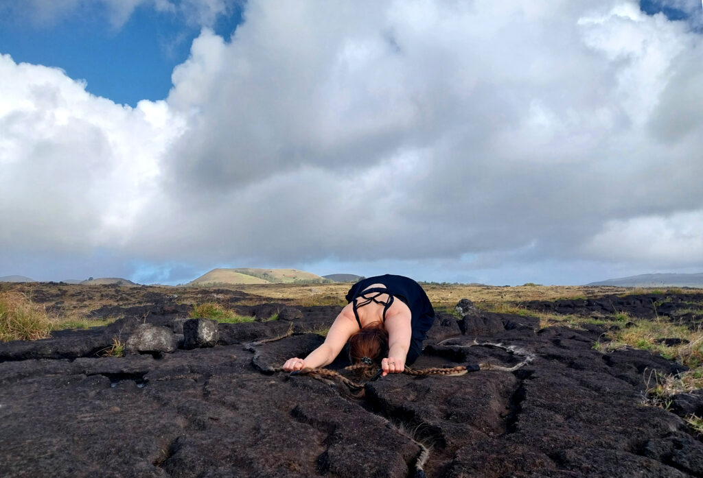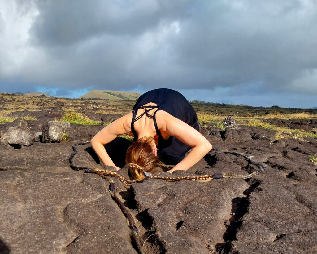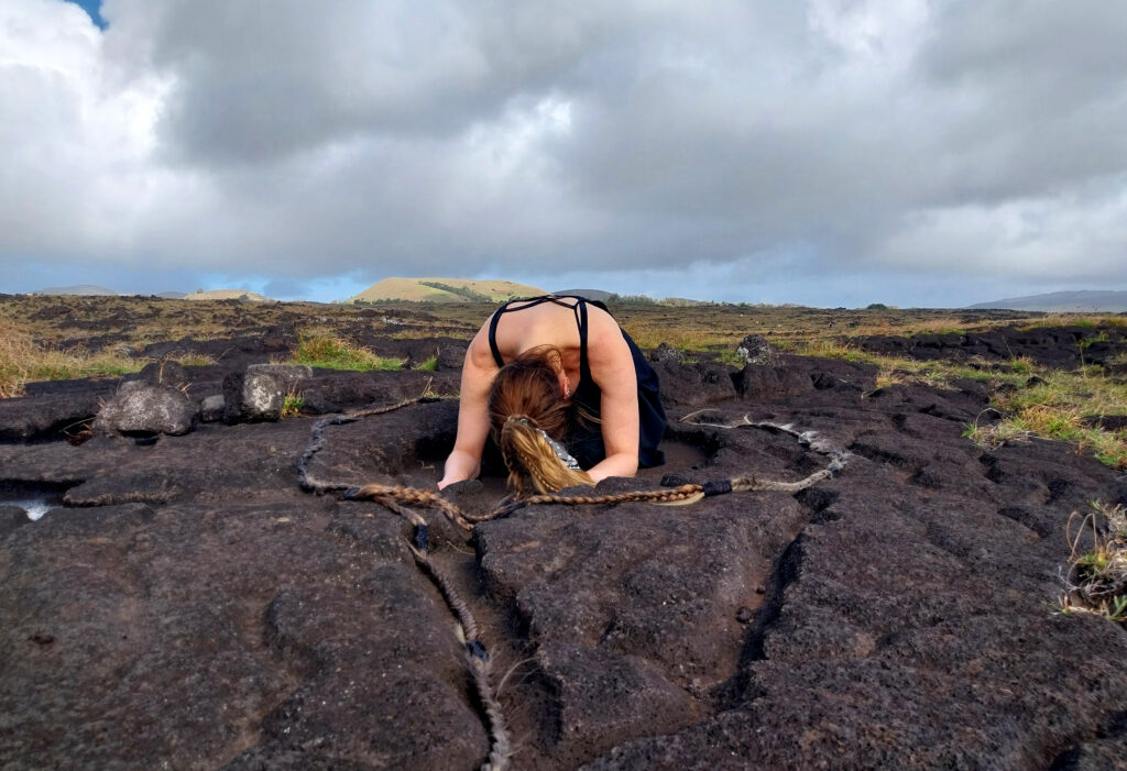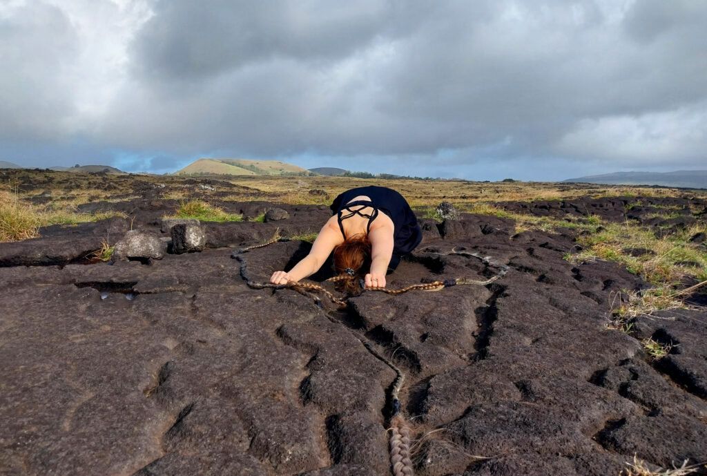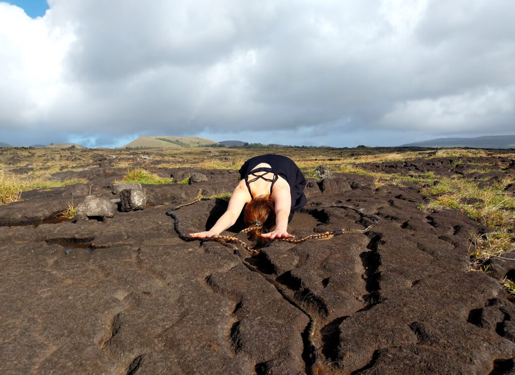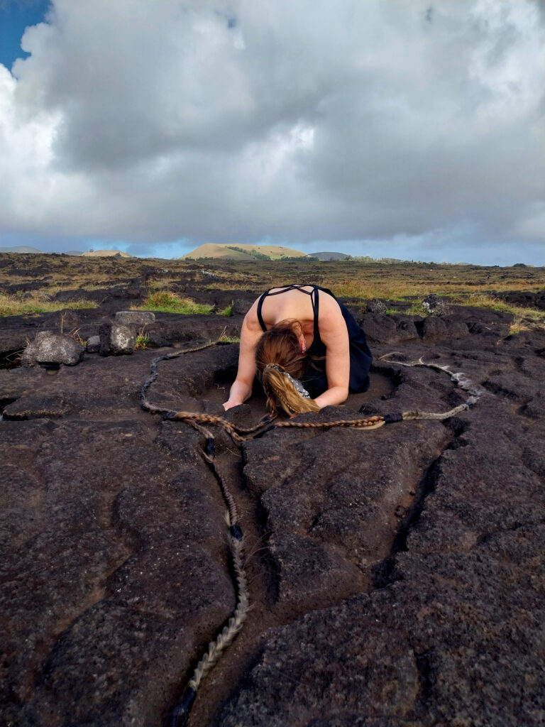 Performance realizada en la isla de Rapa Nui, centradas en el autoconocimiento, autocuidado, la sanación y la búsqueda de preguntas en torno a la memoria y saberes ancestrales.