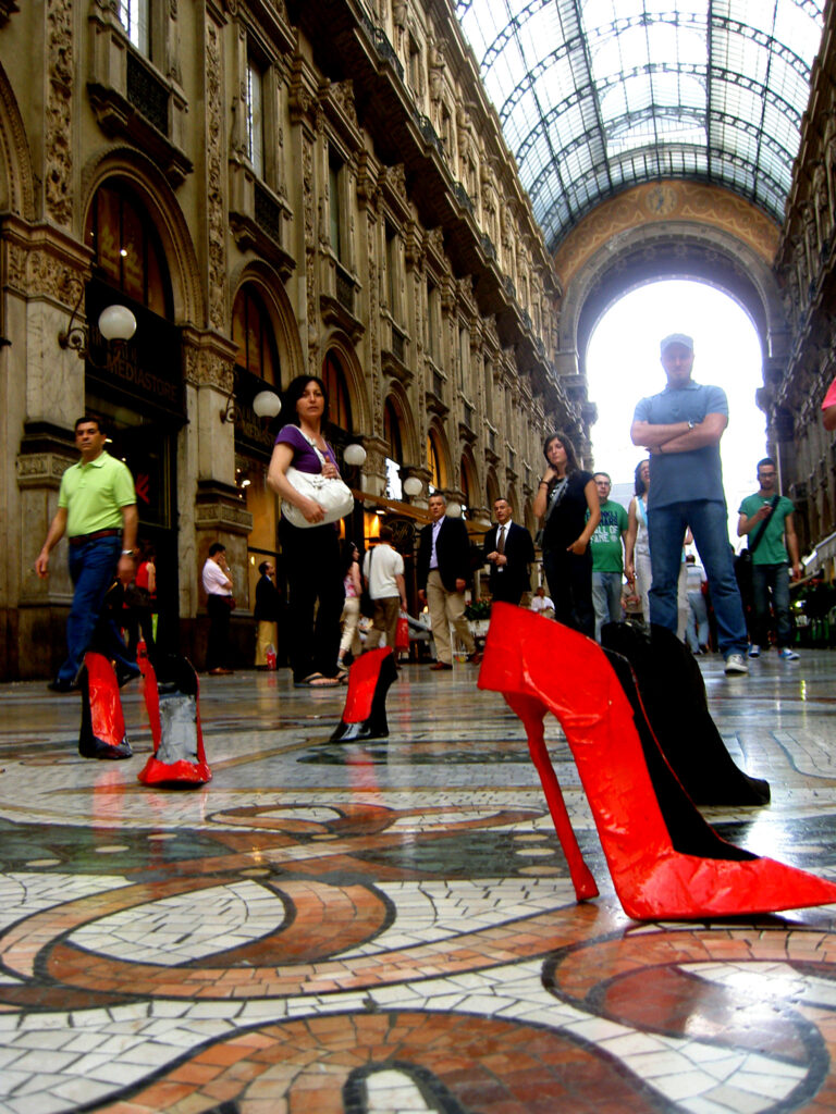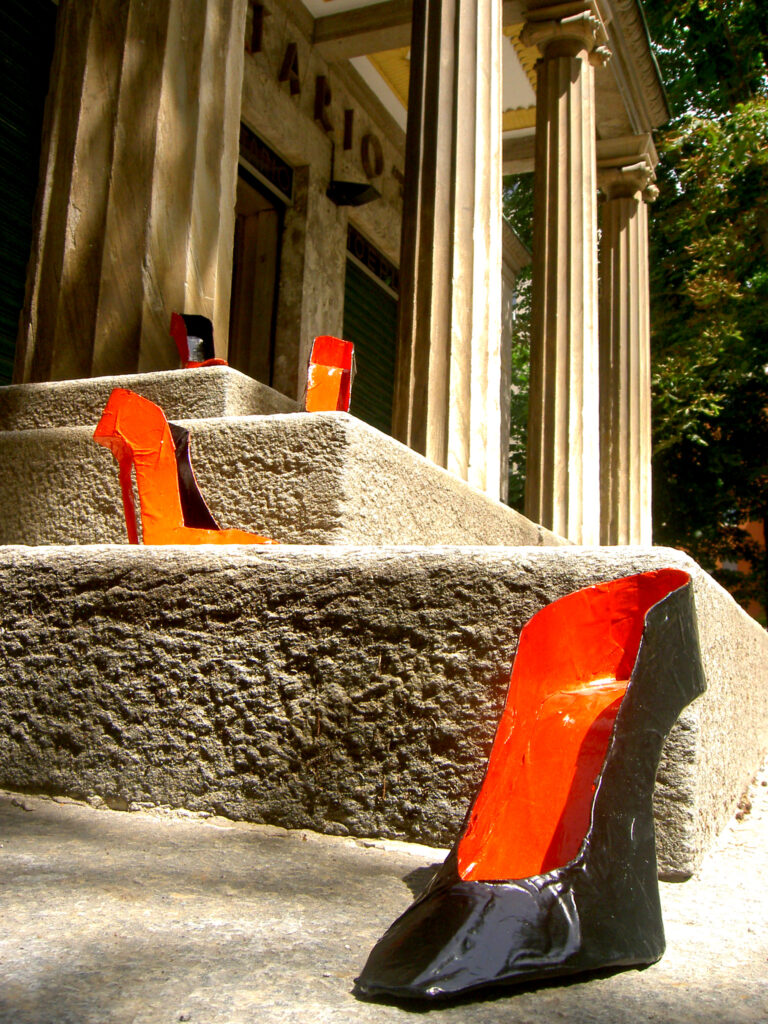 En esta propuesta artística, visual y poética hago una prolongación de mi trabajo ocn zapatos en papel maché iniciado en el año 2003, ampliando formato y soporte de obra. La propuesta es caminar por los muros y calles de distintas ciudades, con los zapatos de tacón fabricados en papel maché, como protagonistas, proponiendo un juego efímero entre el caminante habitual de la ciudad y quienes van de paso por ellas, con nuestras caminantes invisibles….