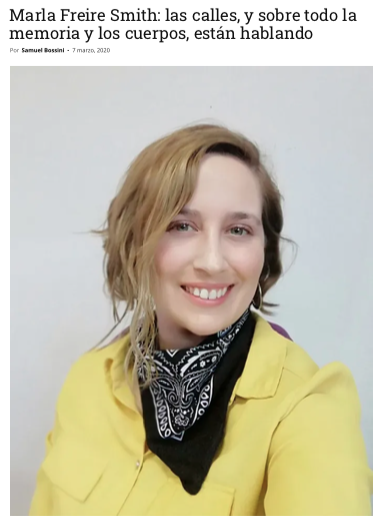Entrevista realizada por Samuel Bossini, para Revista La Santa Crítica: Marla Freire Smith: las calles, y sobre todo la memoria y los cuerpos, están hablando. (07-03-2020).