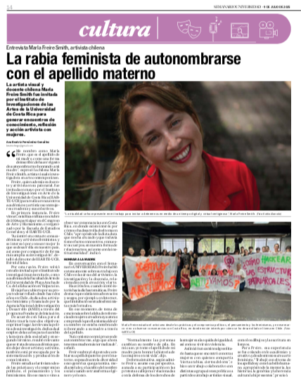 Entrevista Marla Freire Smith, artivista chilena. La rabia feminista de autonombrarse con el apellido materno, Semanario Universidad de Costa Rica.